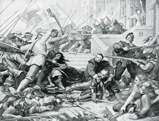 At Shelford Manor near Nottingham 160 Royalist soldiers were slaughtered along with women and children. The Puritan attack was so frenzied because they were fighting soldiers from the Queen’s regiment— mostly European and every one of them Catholic. Foreign Catholics. A red rag to all right thinking Englishmen. Think English Defence League vs a Bangladeshi Muslim detachment. Think Srebrenica.